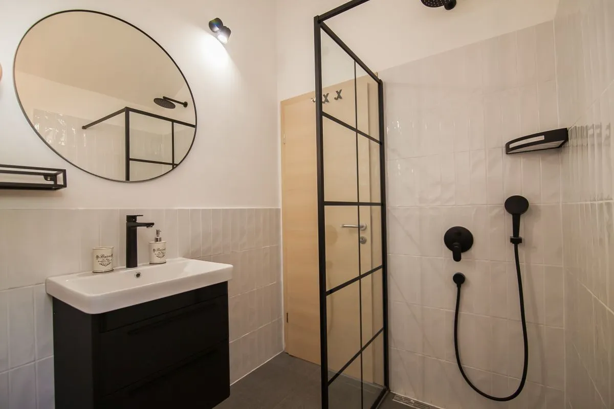 Prihvatite prostrani vanjski prostor opremljen roštiljem, velikim stolom za objedovanje, dnevnim boravkom, ležaljkama i tušem.