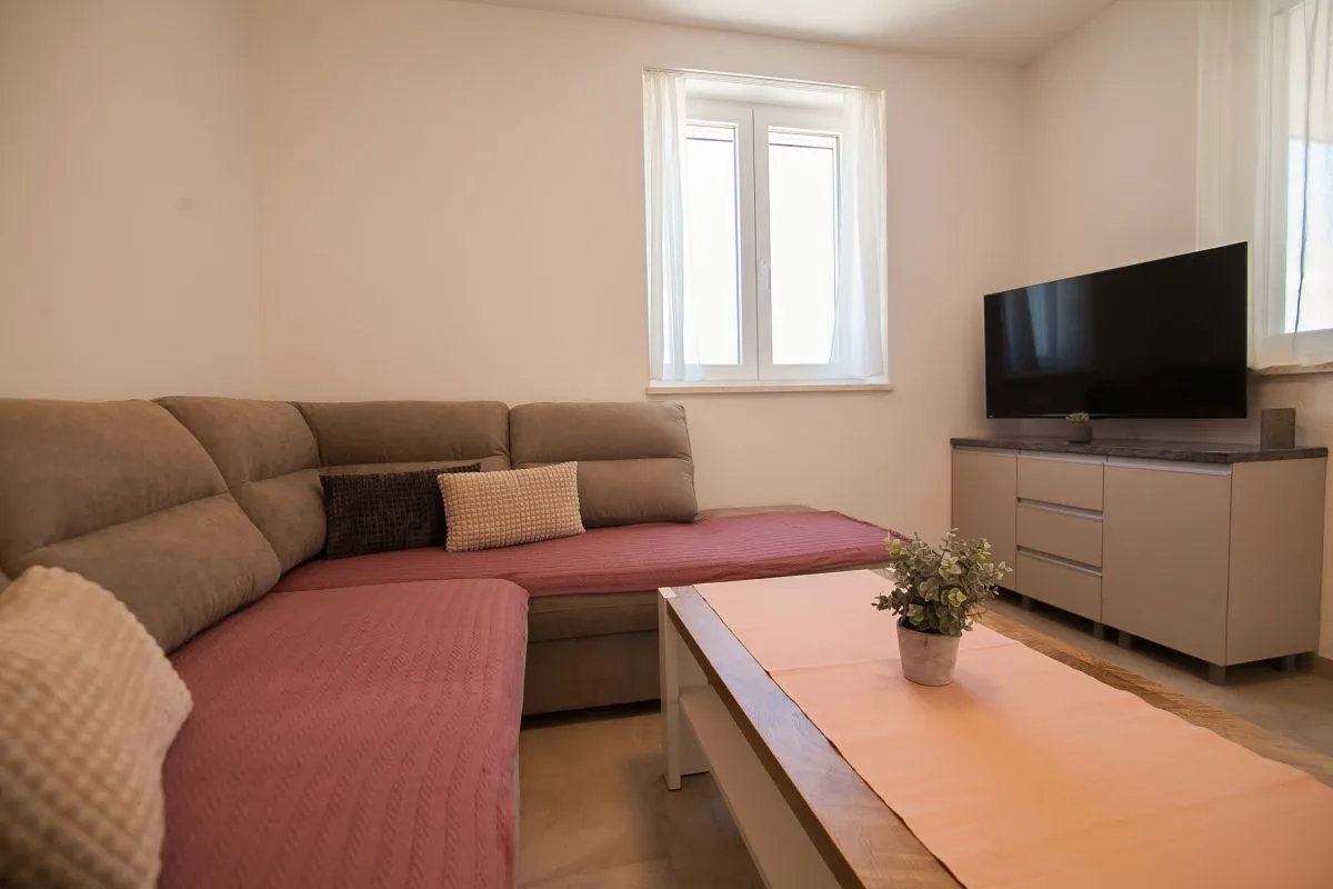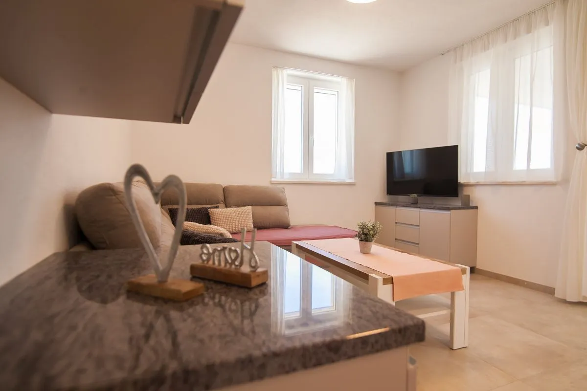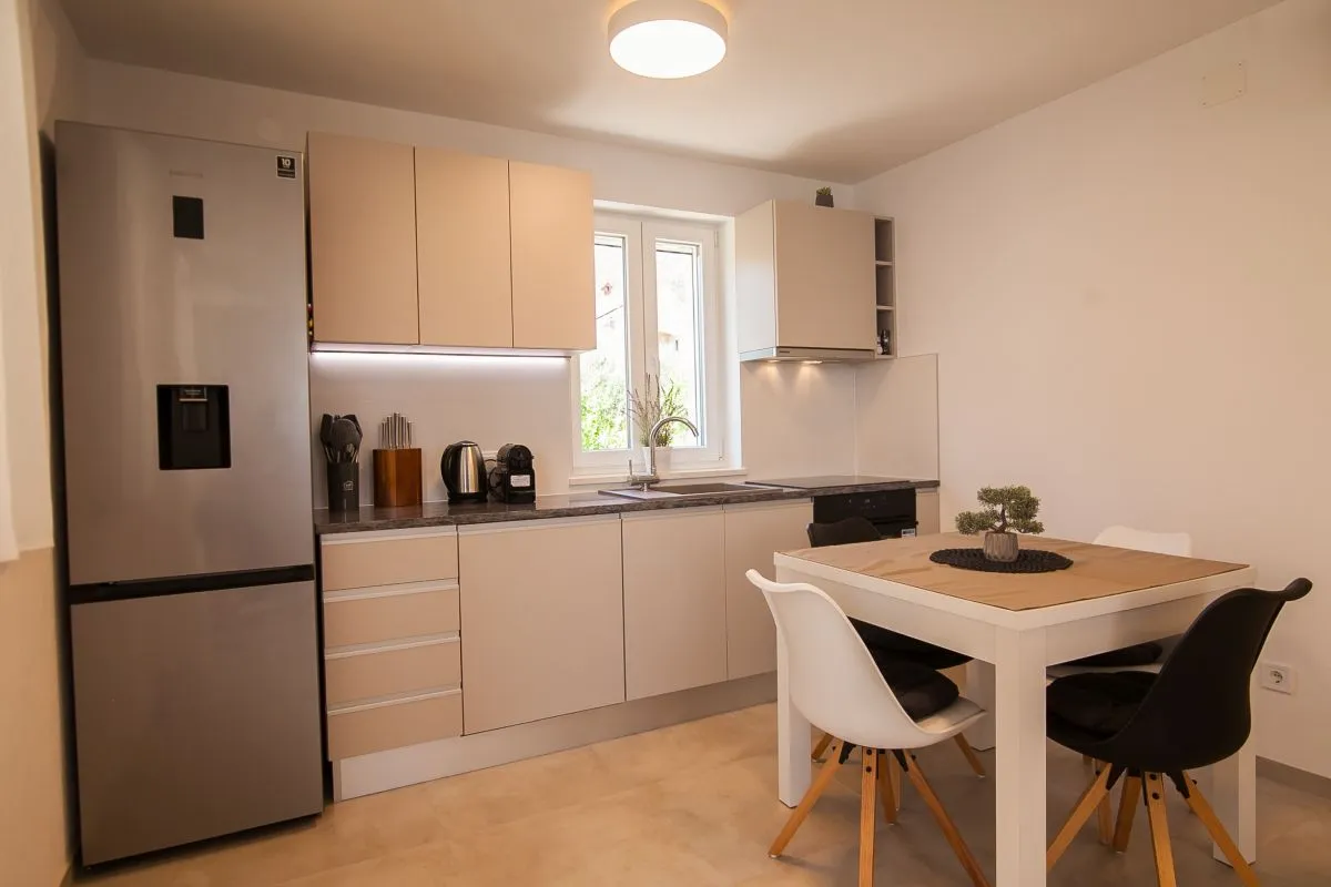 Newly built modern 3-bedroom apartment in the center of Bol. This top-quality air-conditioned apartment accommodates up to 6 people and it is located in a renovated house. It consists of two bedrooms with super king-size beds and one bedroom with two single beds. Each bedroom has a wardrobe and SAT TV. There is a living room area that has a large sofa, SAT-TV, and WiFi, a dining area with a table that can be extended for 6 people, and a modern and fully equipped kitchen with all the appliances and utensils you might need. The apartment has two full bathrooms, of which one is en suite and one has a washing machine. The best feature of the apartment is the outside area, with a table and chairs for 6 and a summer kitchen with an electric grill and a refrigerator.