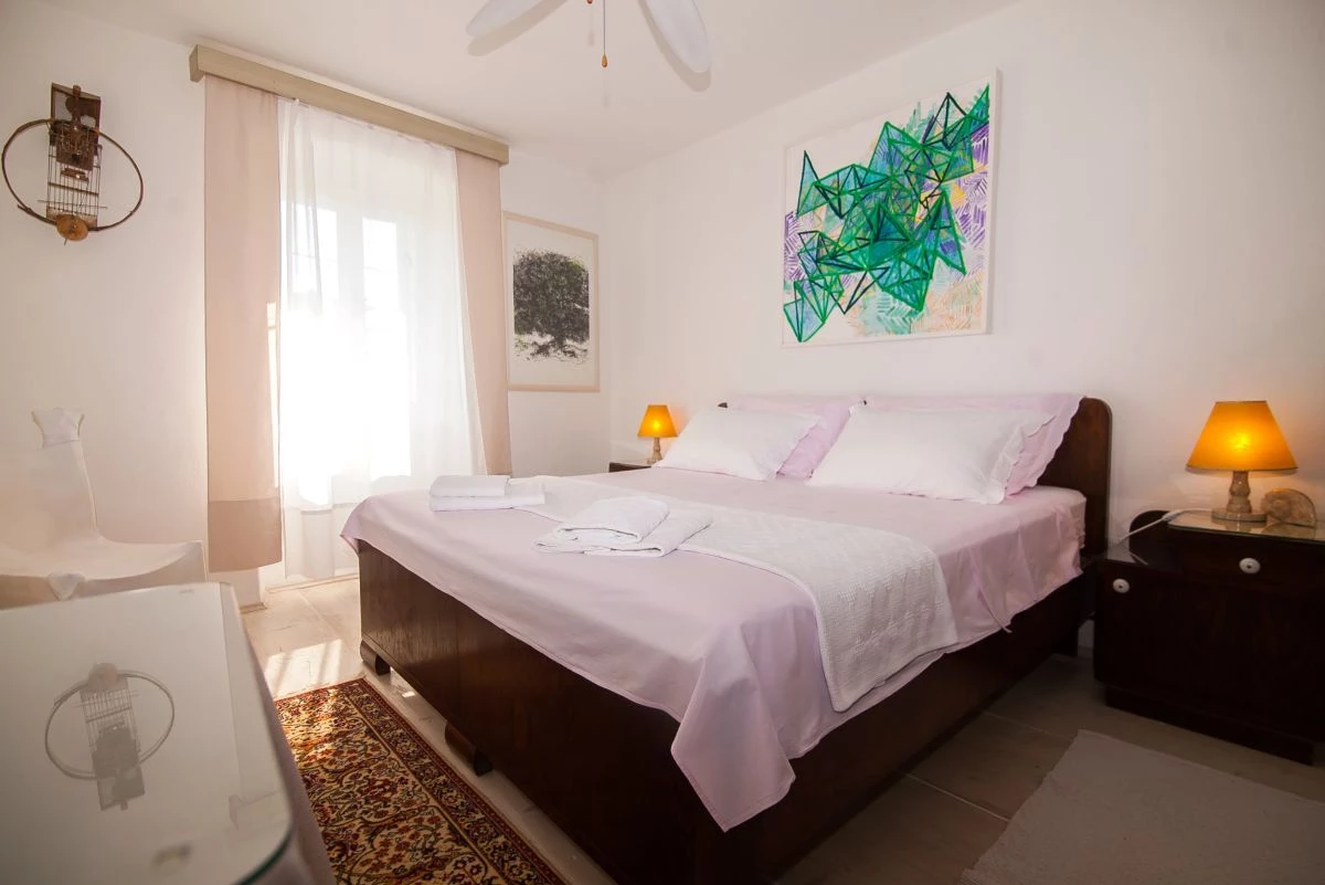 Holiday Home ART is an authentic 2-storey Dalmatian stone house (100 m²). It has been fully modernized to keep up with 21st-century comforts. The house is located in the center of Bol and it can accommodate up to 6 people. It consists of 3 bedrooms, 3 bathrooms, a living room, a kitchen, a patio, and a charming shaded backyard with sun loungers and a gas BBQ.