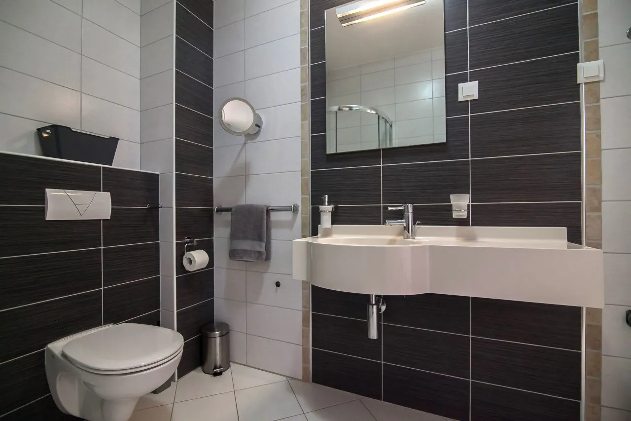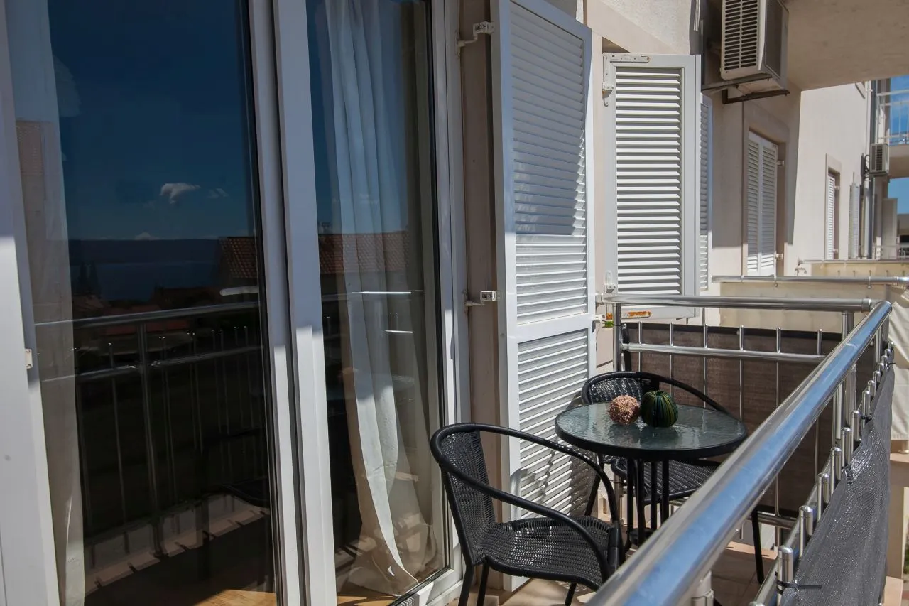 sunny balcony with sea view and a spacious bathroom with a shower.