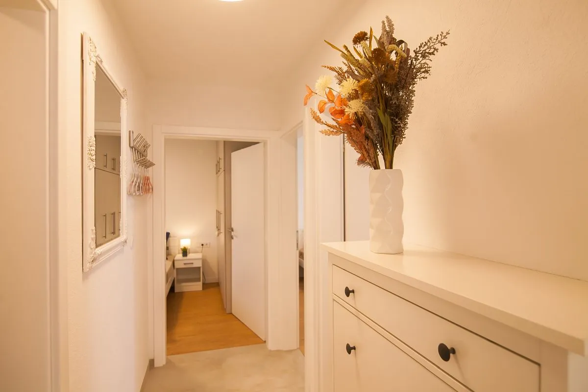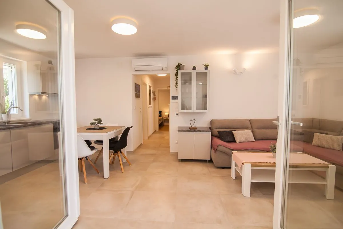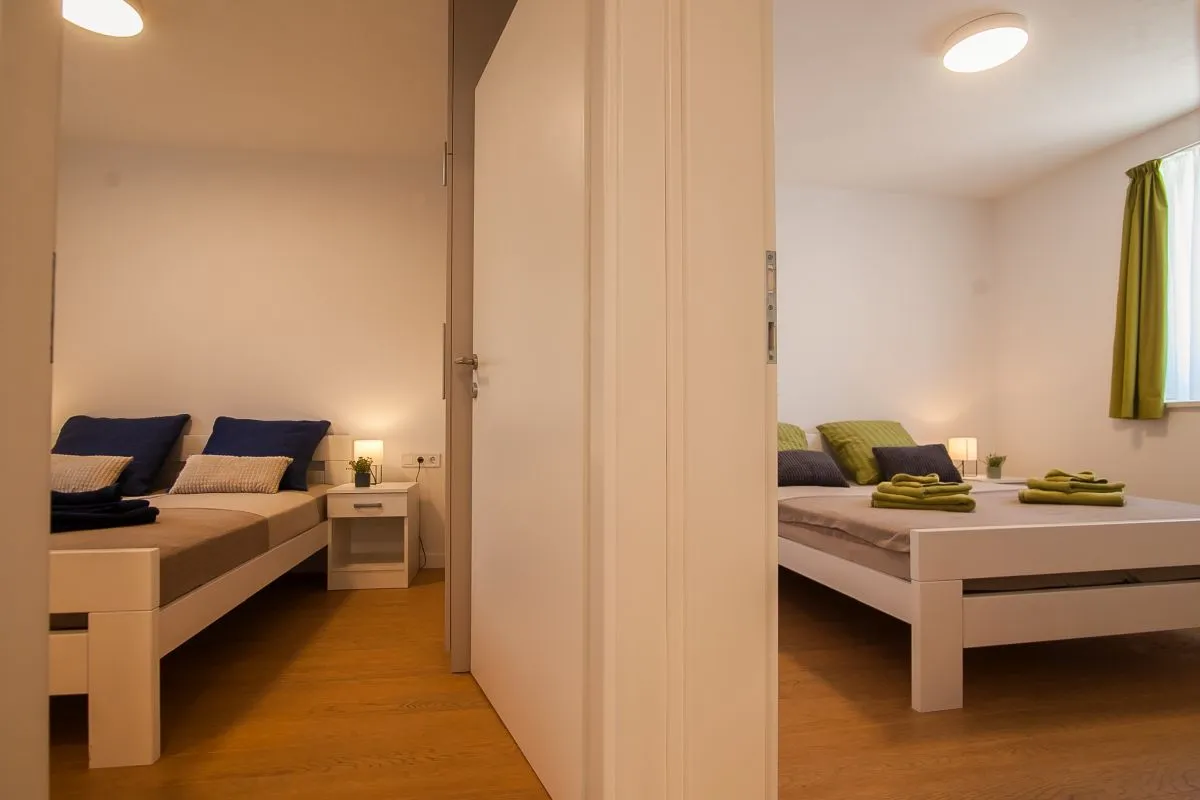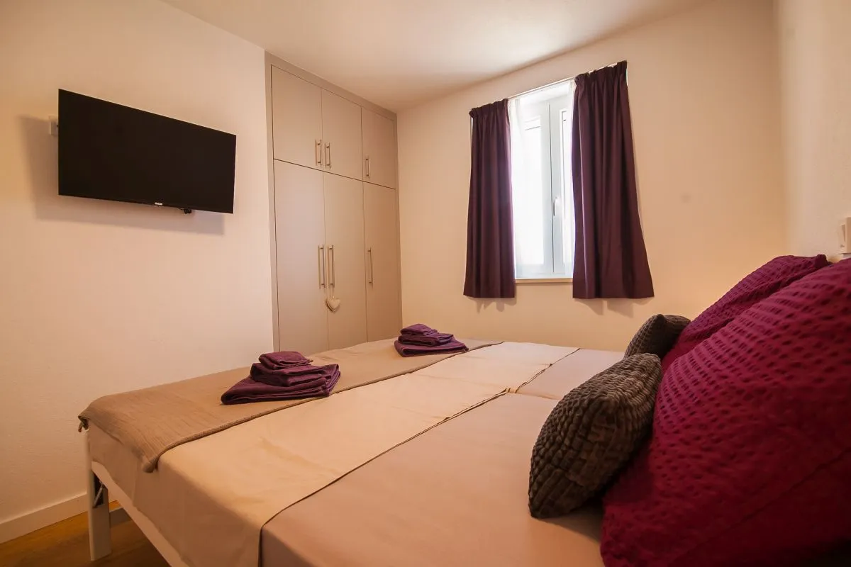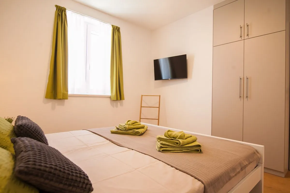 Newly built modern 3-bedroom apartment in the center of Bol. This top-quality air-conditioned apartment accommodates up to 6 people and it is located in a renovated house. It consists of two bedrooms with super king-size beds and one bedroom with two single beds. Each bedroom has a wardrobe and SAT TV. There is a living room area that has a large sofa, SAT-TV, and WiFi, a dining area with a table that can be extended for 6 people, and a modern and fully equipped kitchen with all the appliances and utensils you might need. The apartment has two full bathrooms, of which one is en suite and one has a washing machine. The best feature of the apartment is the outside area, with a table and chairs for 6 and a summer kitchen with an electric grill and a refrigerator.