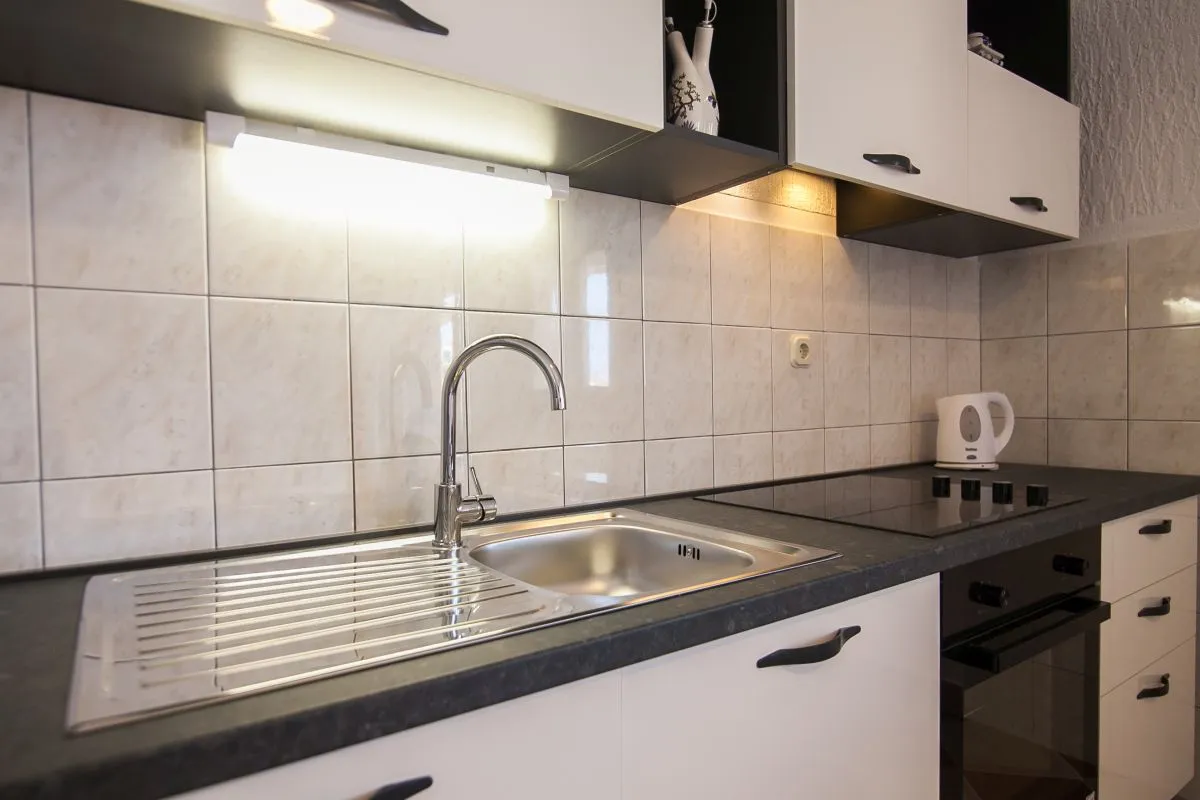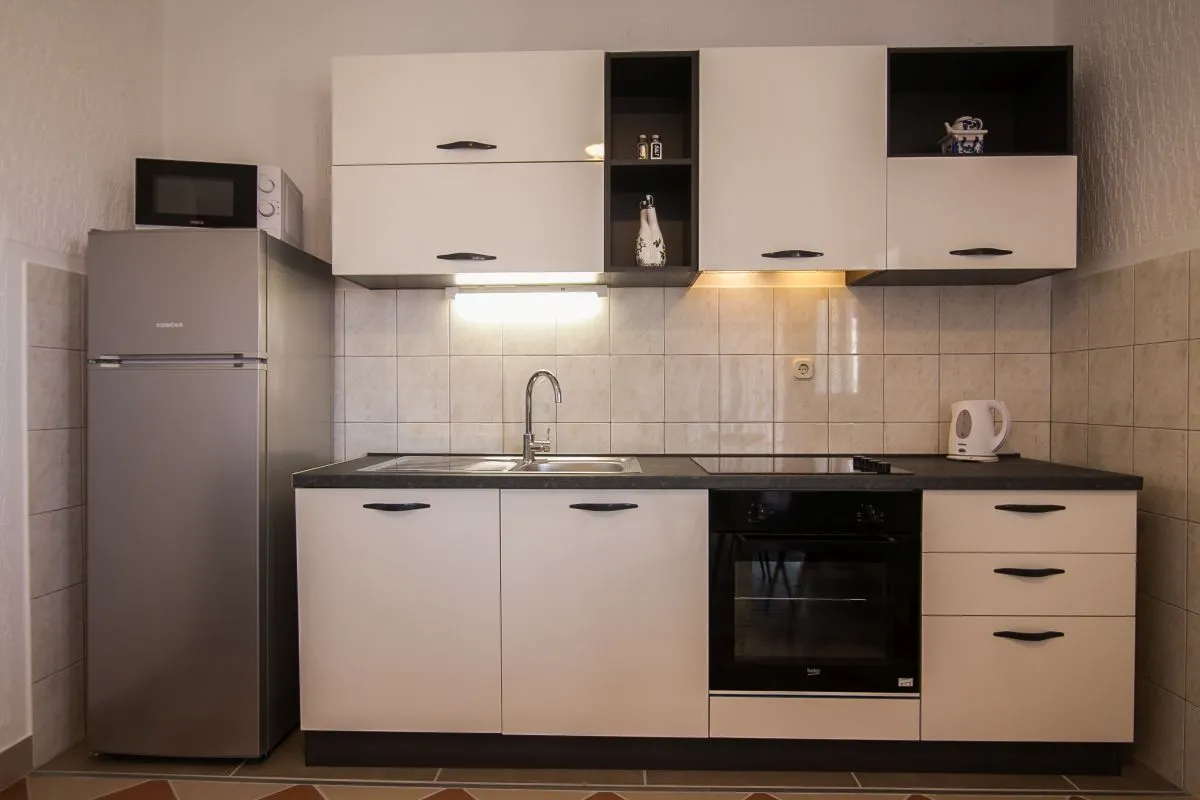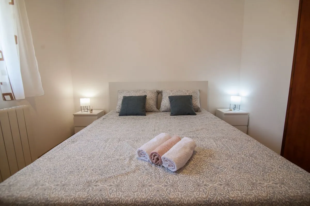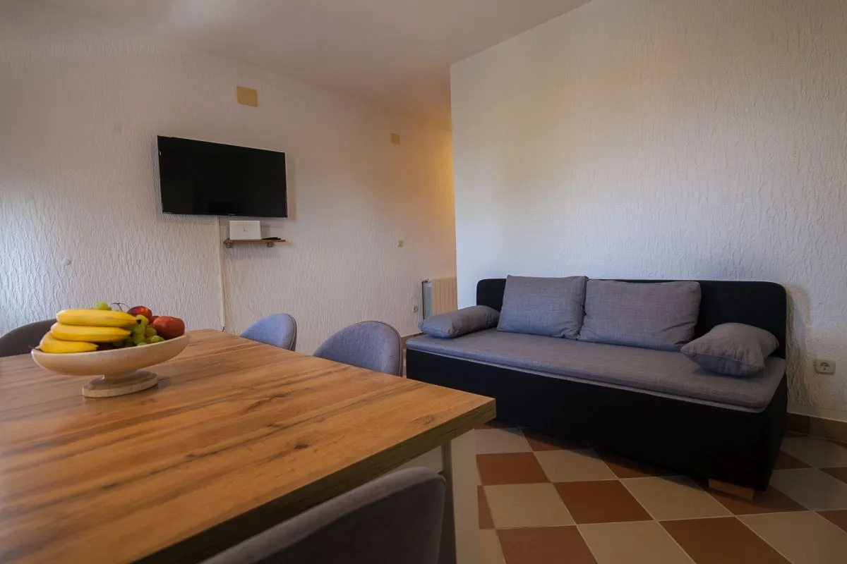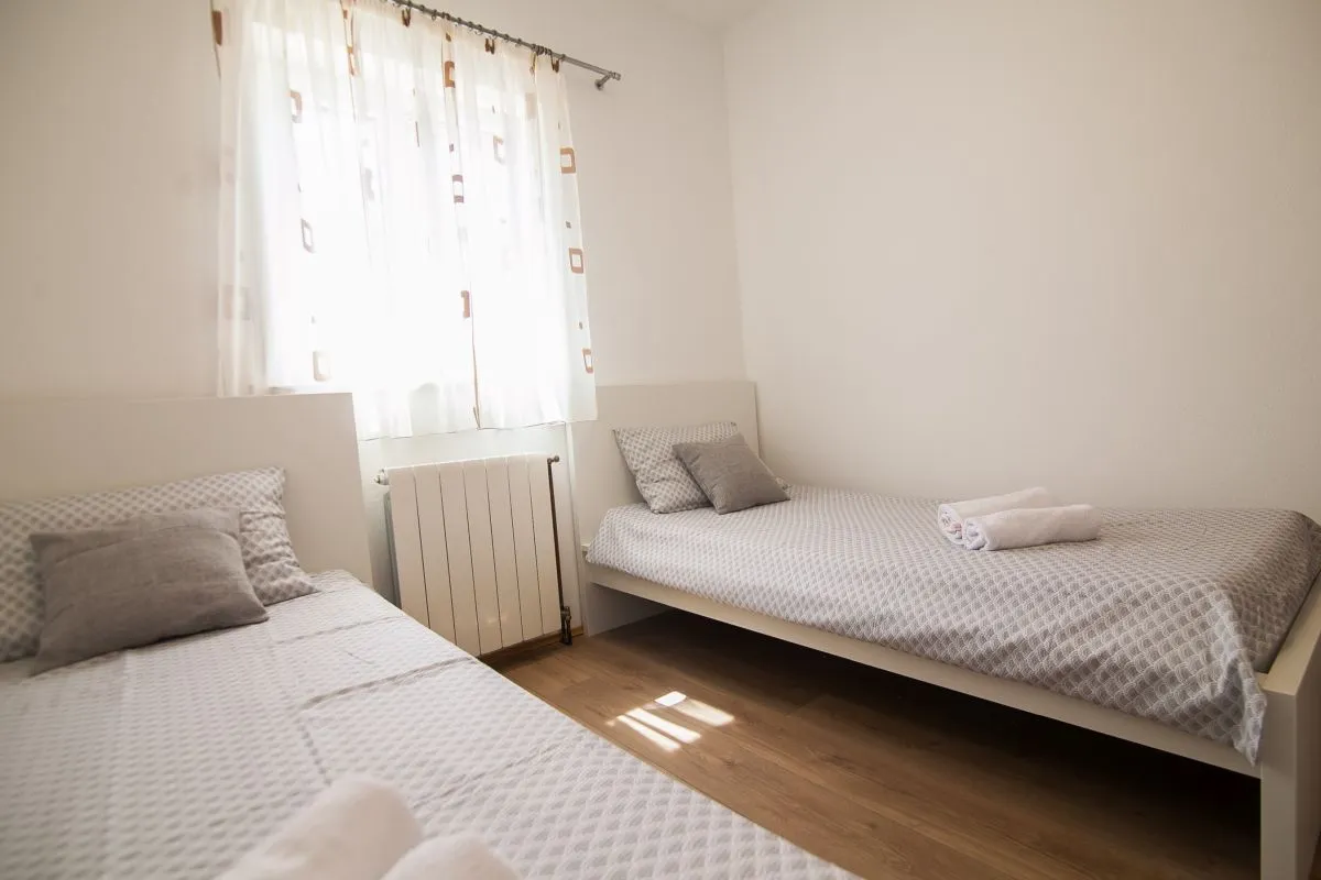Completely refurbished 2-bedroom apartment for 4 people. Located on the first floor in peaceful greenery surrounded area. Only 1 minute from the market, 2 minutes from the restaurant and 5 minutes from the center, and the closest beach. The apartment has a terrace with a table and chairs for 4 people, a living/dining area with a sofa and SAT-TV for relaxing, a large dining table, 2 bedrooms, a master bedroom with a queen-size bed, and a second bedroom with two single beds, completely new and fully equipped kitchen and bathroom with shower and a washing machine.